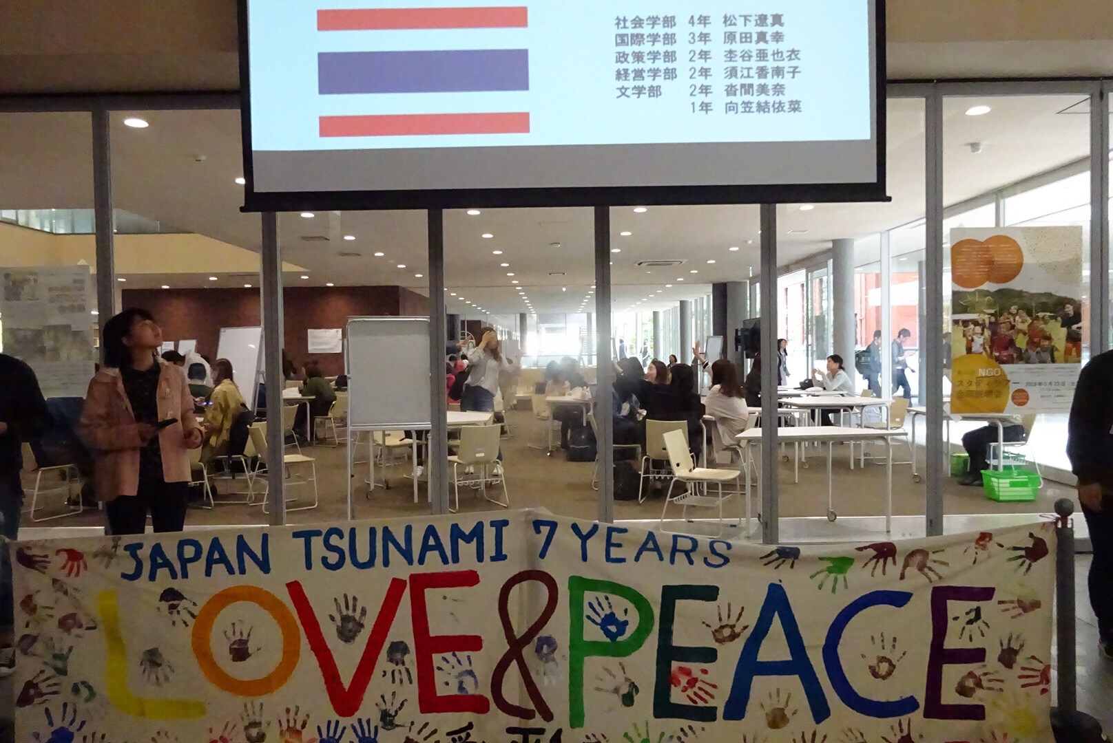 5月10日、被災地をつなぐさをり織りを龍谷大学の深草キャンパスにて開催した海外体験学習プログラムの報告会にて展示しました。