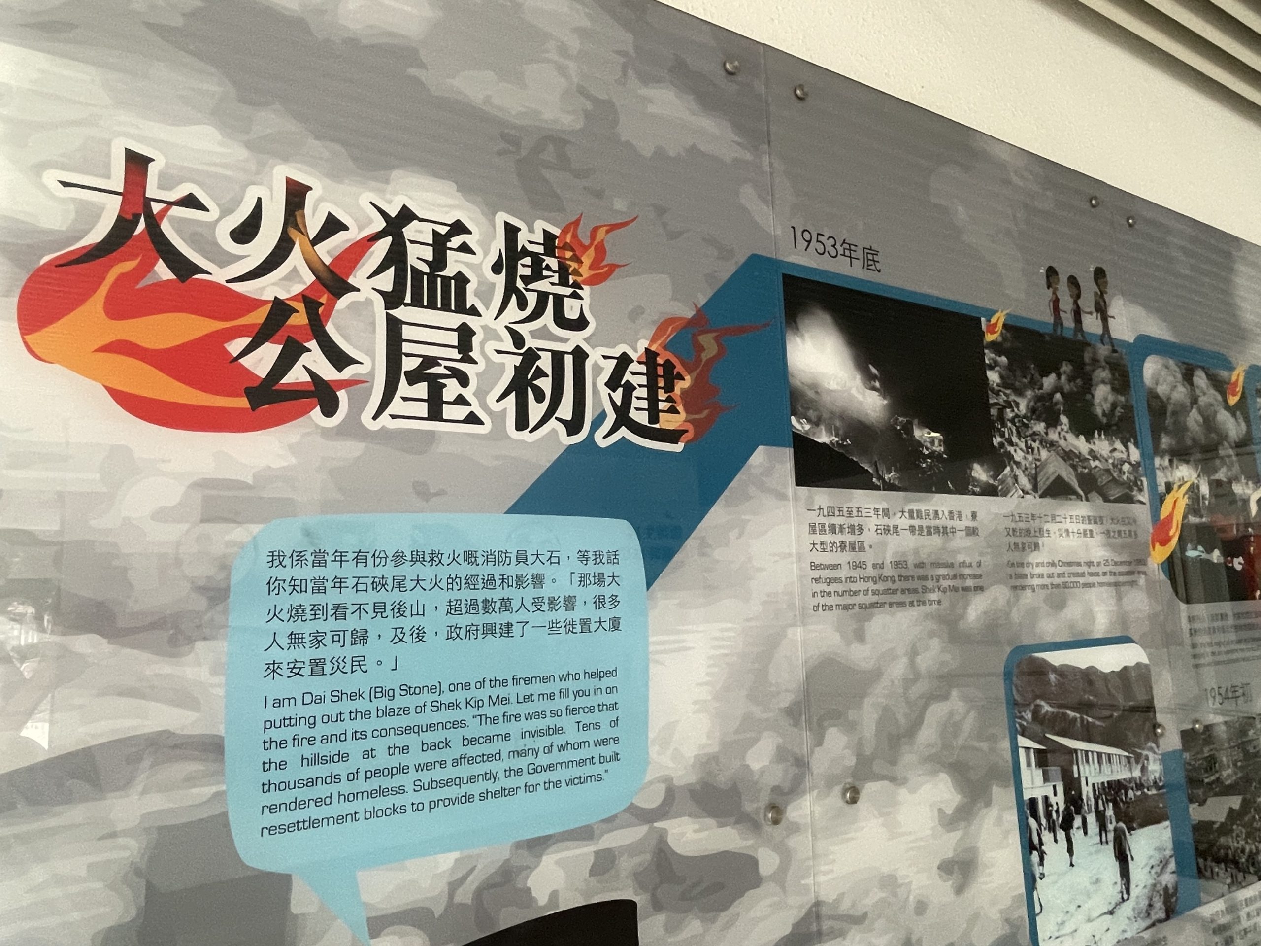 イギリス領だった香港は、中国の南北戦争に一定の決着がついたら、難民は元の地域に戻ると考えていたようですが。人口の1/4は密集した木造のバラック建ての建物の場所に住み続けました。当然、火事が起きると一気に燃え広がり、大火事が頻発していたそうです。