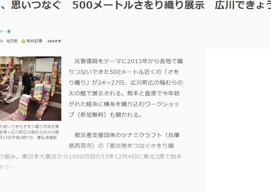 メディア , ワークショップ , 被災地をつなぐさをり織り tsunamicraft 15 1月 2020 被災地をつなぐさをり織りin甲子園 新聞各社に掲載していただきました 2019年12月27日 読売新聞2019年12月27日 朝日新聞 (阪神大震災25年)さをり織り、被災地結ぶ 来月17… 続きを読む